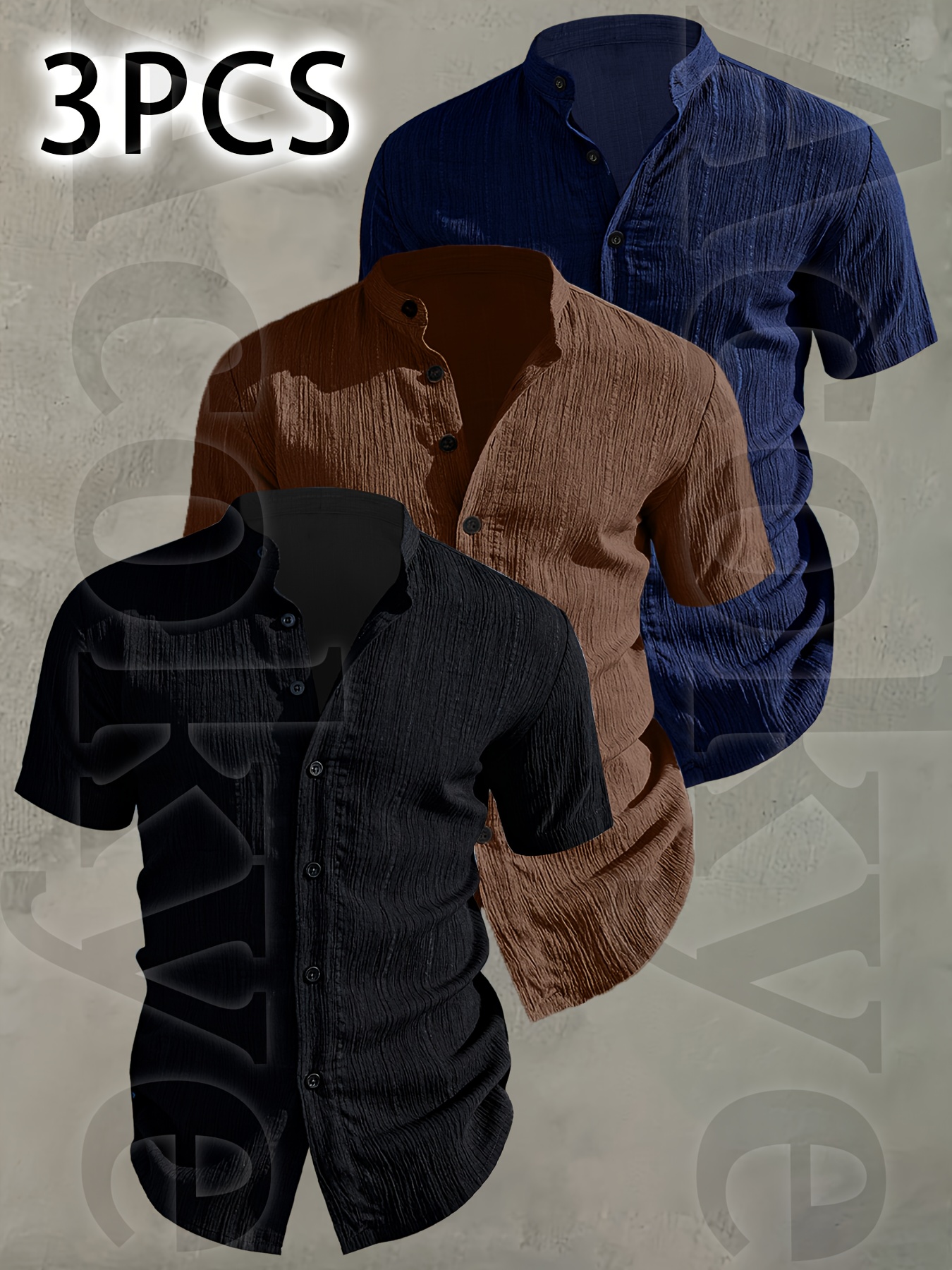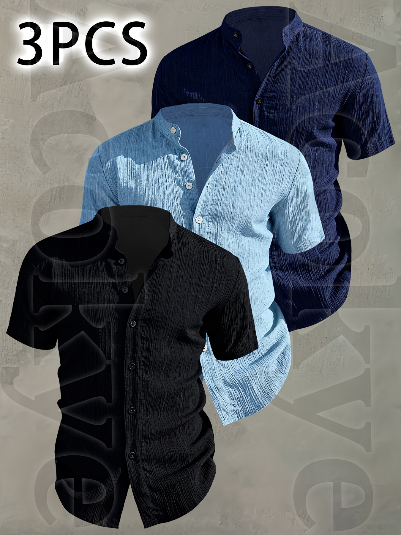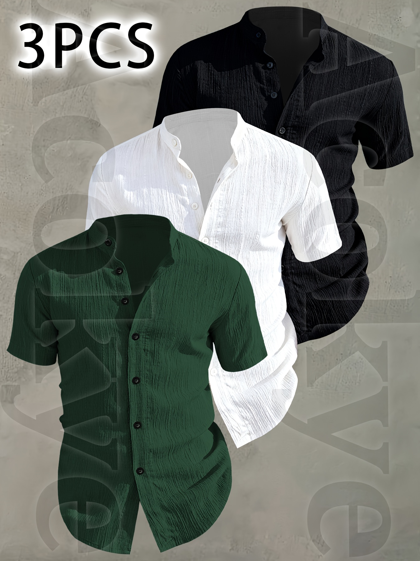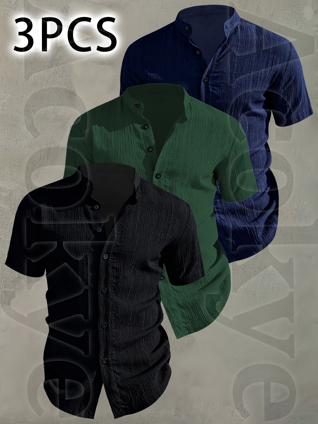 3pcs Set Men's Summer Short Sleeve Shirts • Lightweight Breathable Solid Color Button Casual Shirts with Stand Collar • Ideal for Beach Vacations, Pool Parties, and Daily Wear