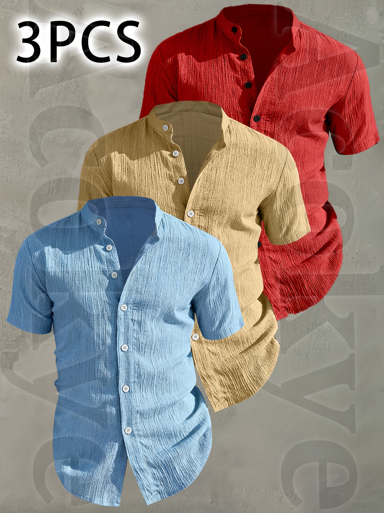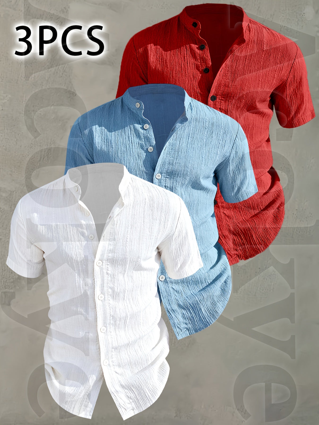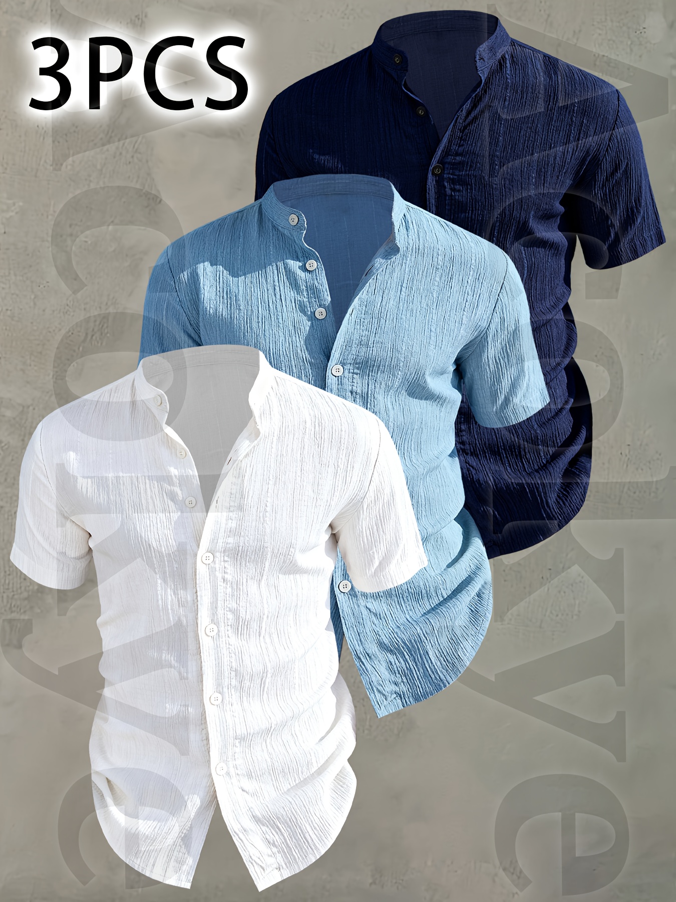 3pcs Set Men's Summer Short Sleeve Shirts • Lightweight Breathable Solid Color Button Casual Shirts with Stand Collar • Ideal for Beach Vacations, Pool Parties, and Daily Wear