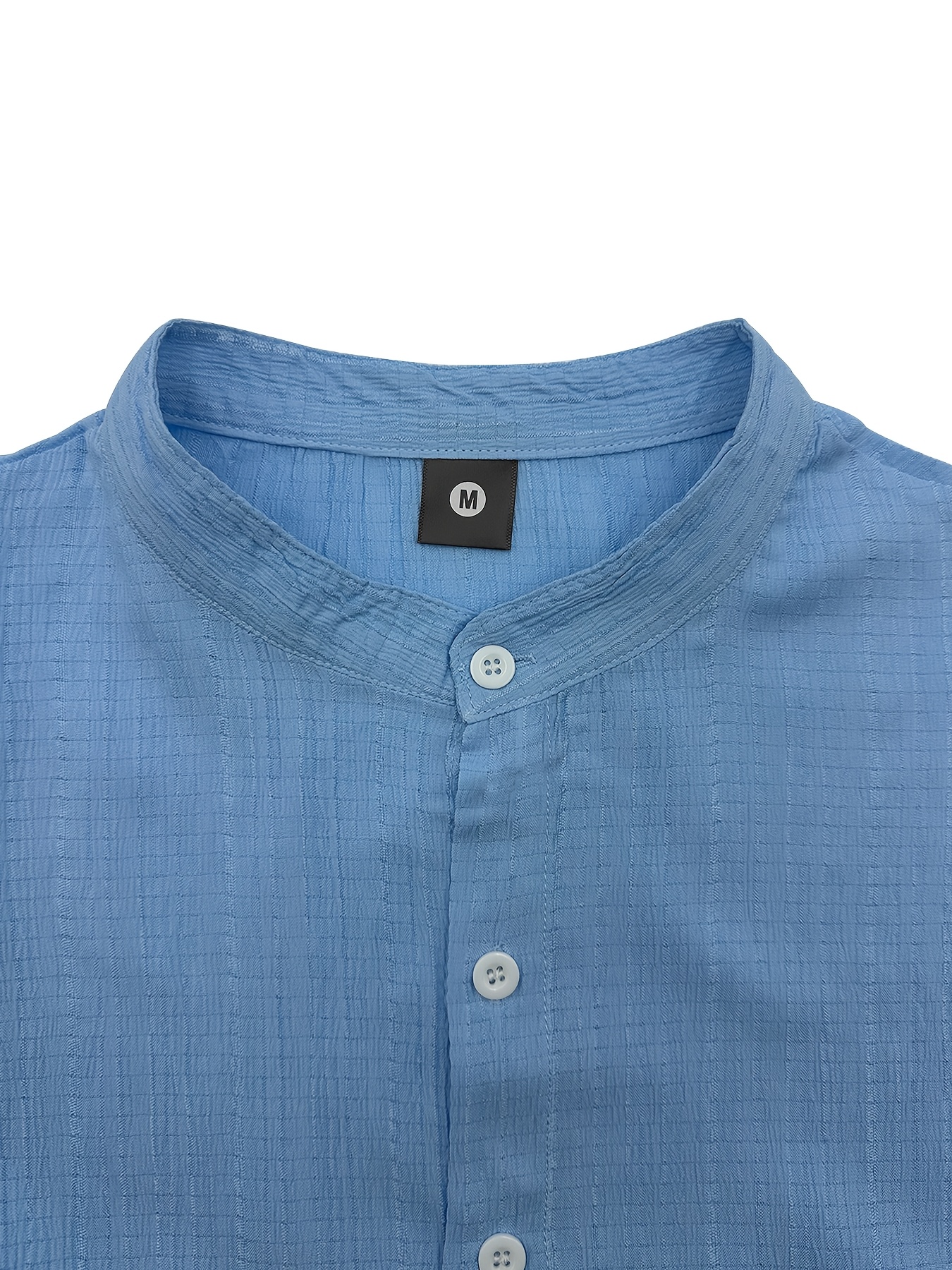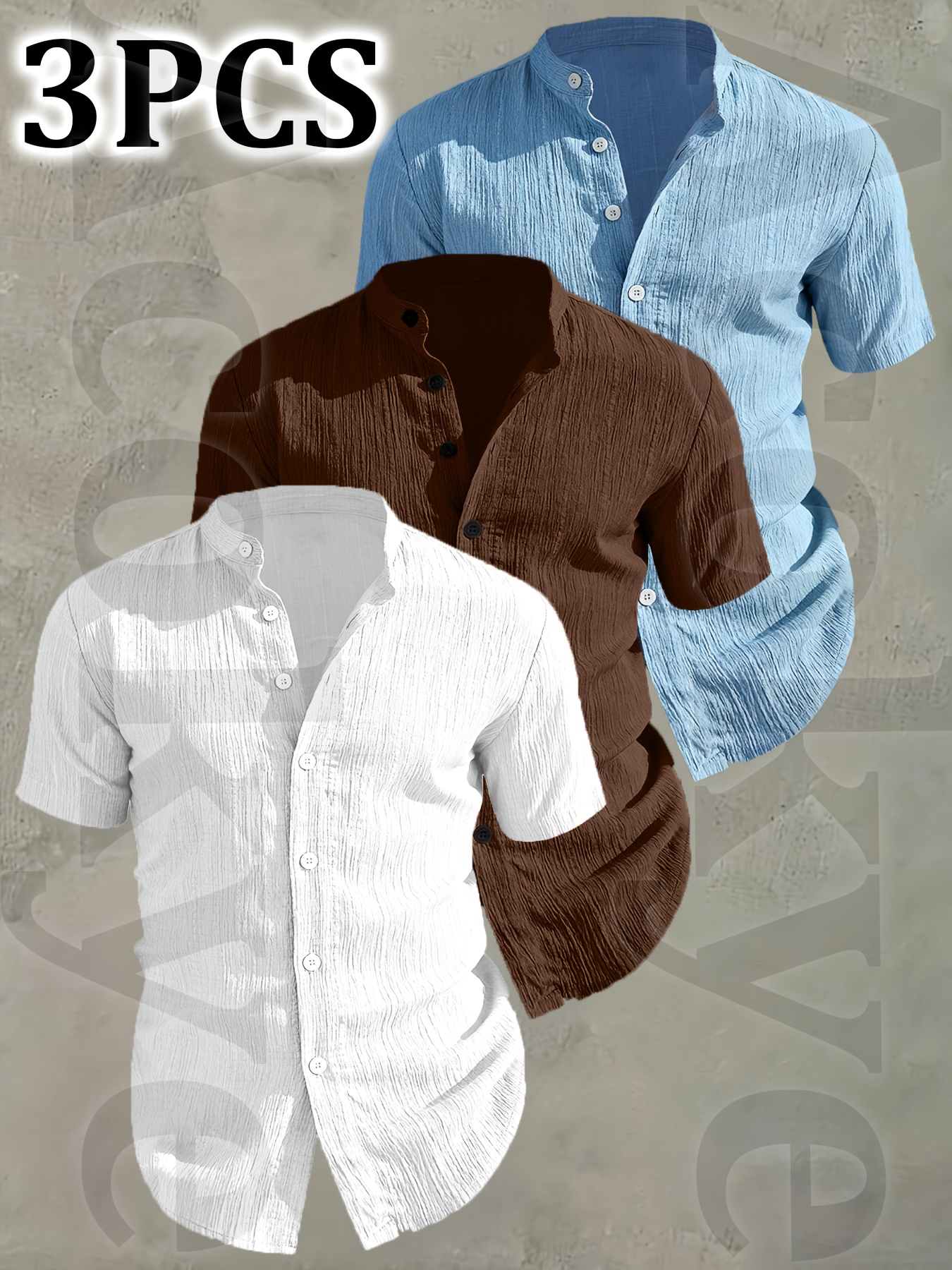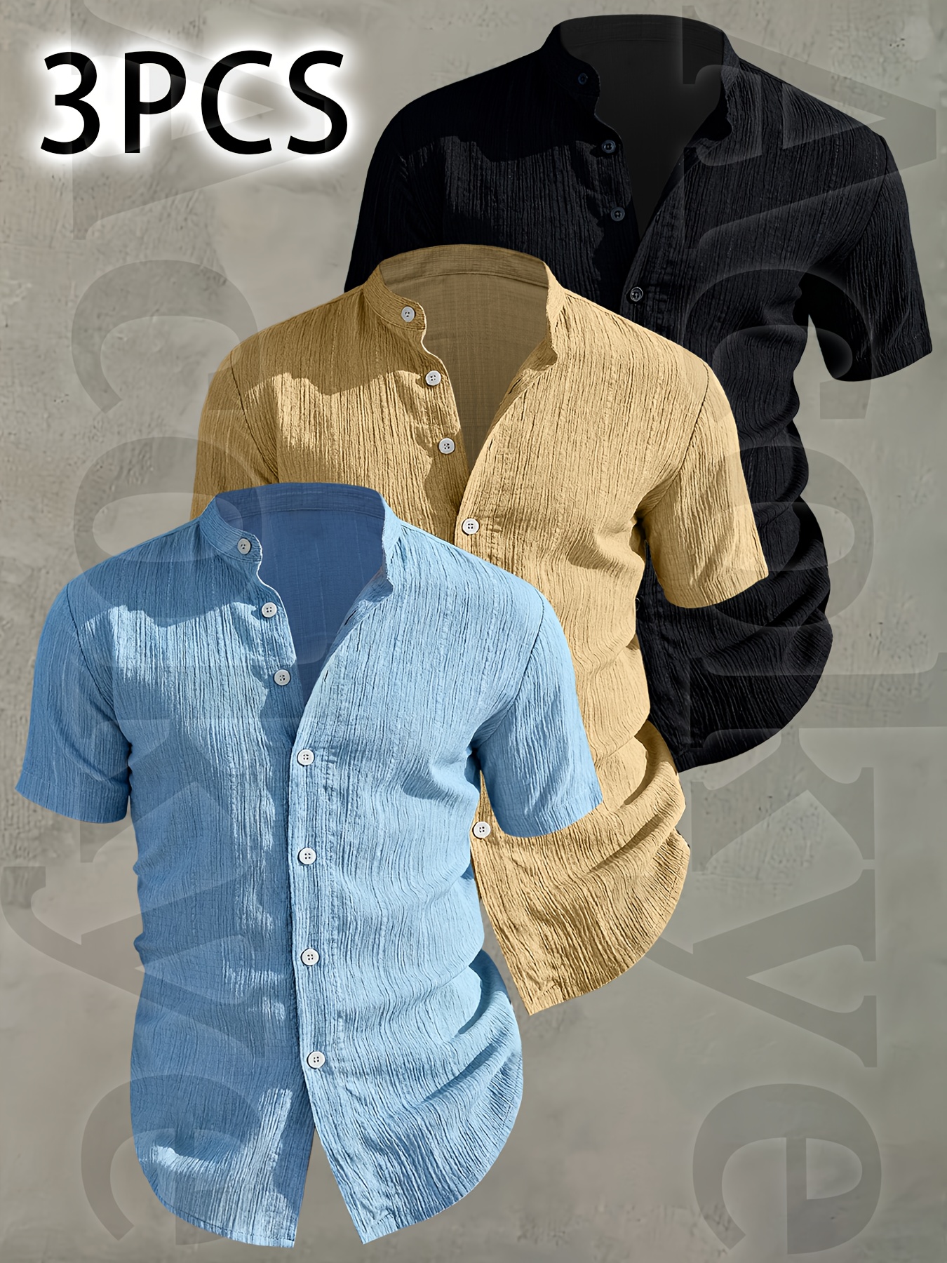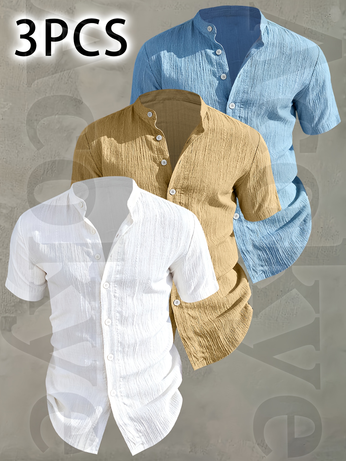 3pcs Set Men's Summer Short Sleeve Shirts • Lightweight Breathable Solid Color Button Casual Shirts with Stand Collar • Ideal for Beach Vacations, Pool Parties, and Daily Wear