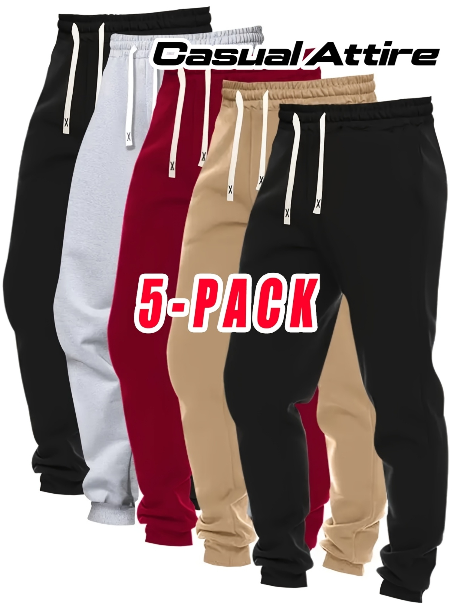 5-Pack Men'S Casual Jogger Pants | Multiple Colors, Elastic Drawstring Waist, Multiple Pockets, Breathable Fabric for Gym, Running, Lounge & Casual Attire - Regular Fit Tapered Ankle, Machine Washable