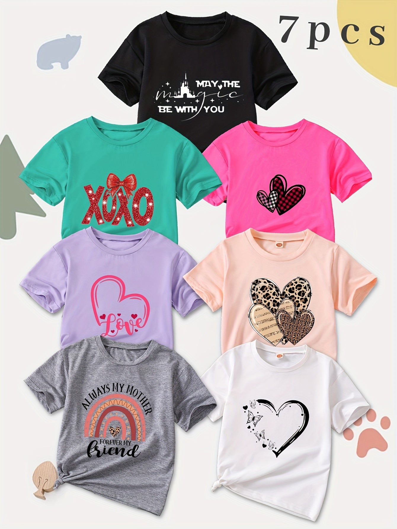 [7pcs Fashion T-shirts] 7pcs Summer Fashion Girls' T-shirts, Comfortable and Skin-friendly, Affordable Short-sleeved Tops with Round Neck