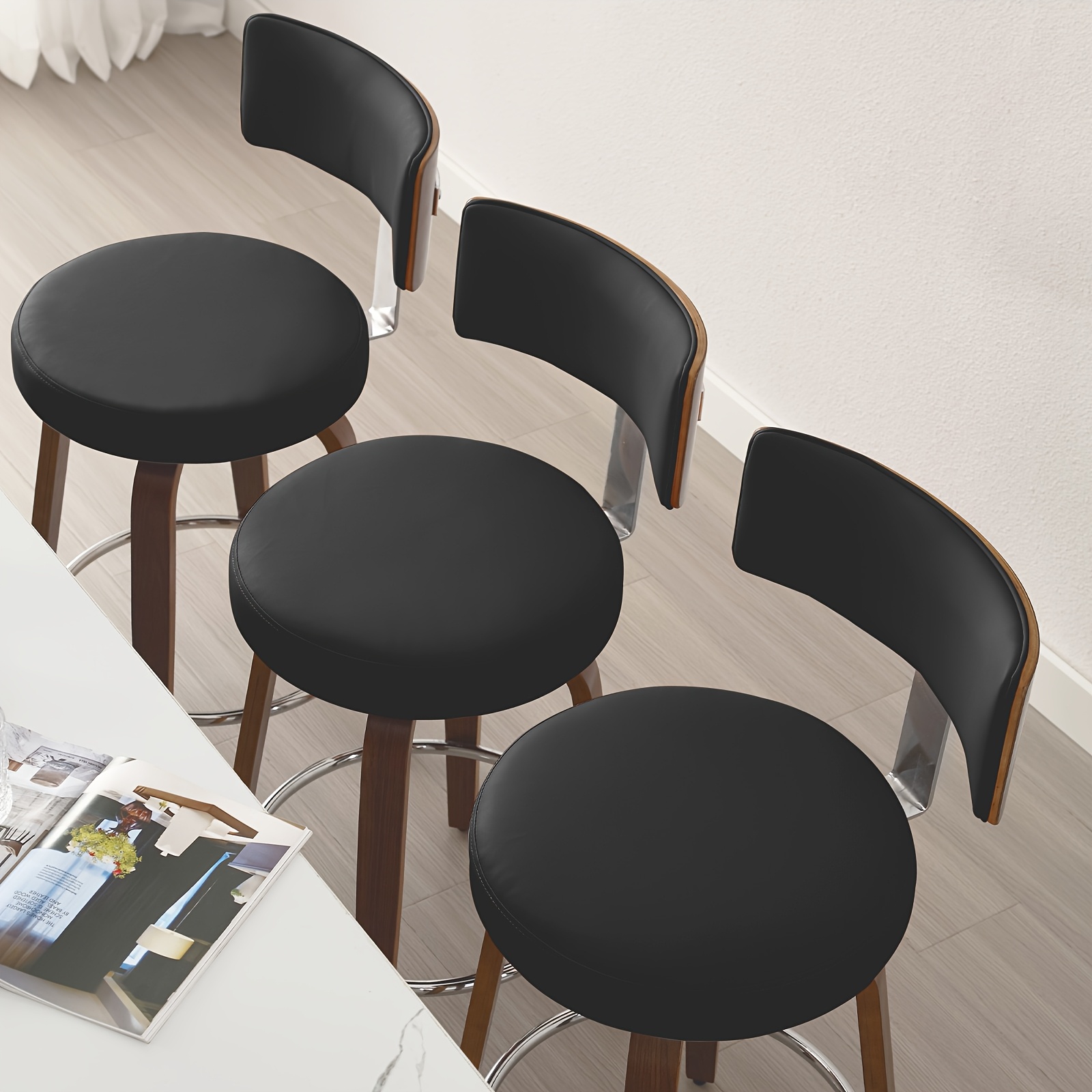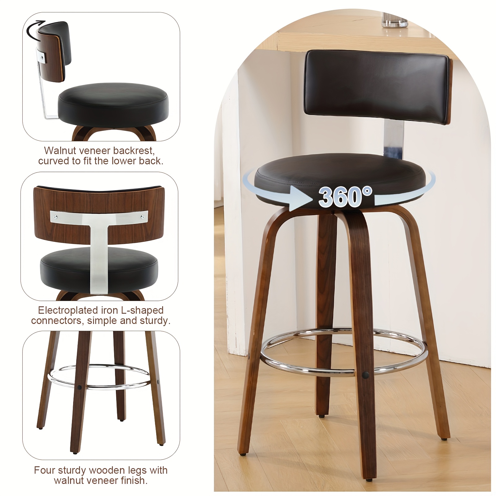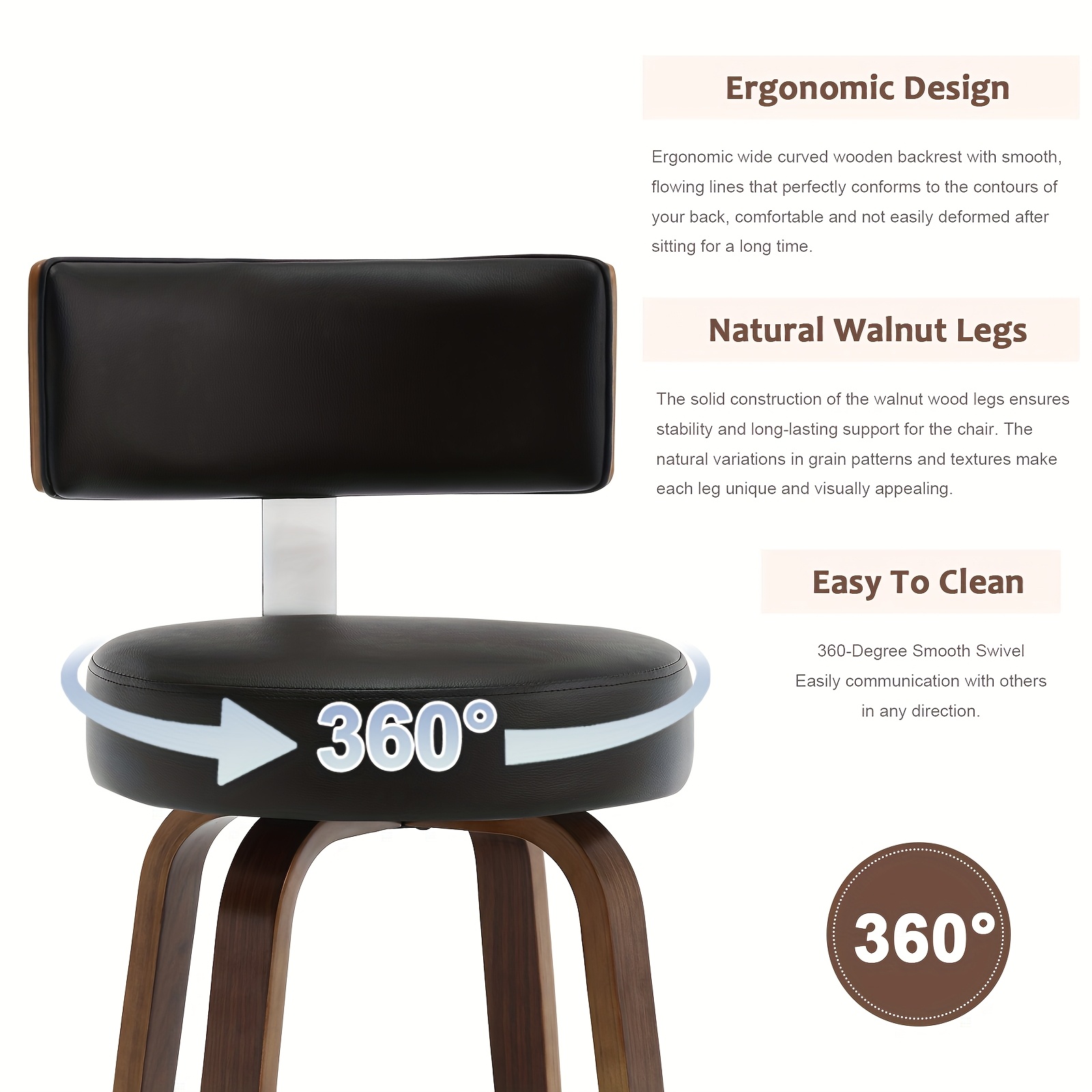 PU leather bar stools that swivel 360° and feature a backrest and a round seat.