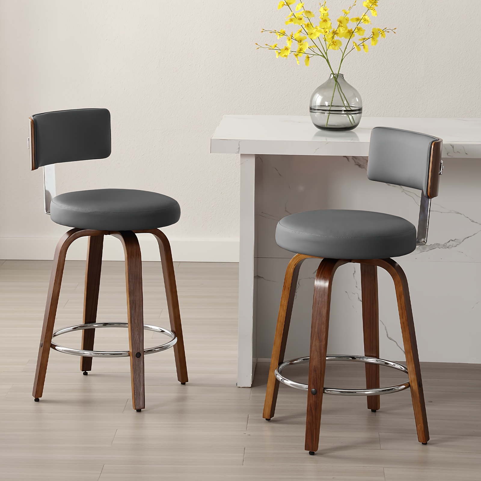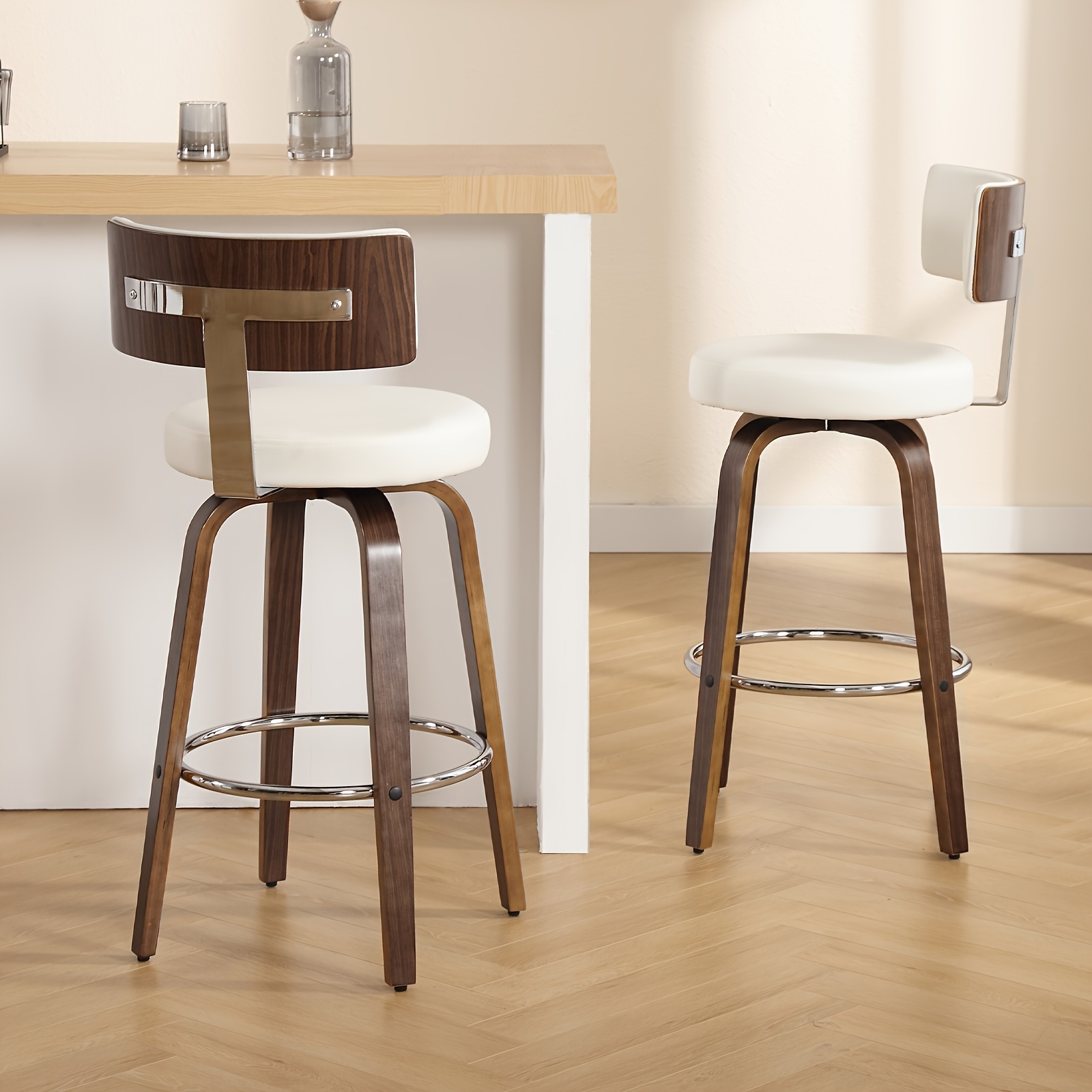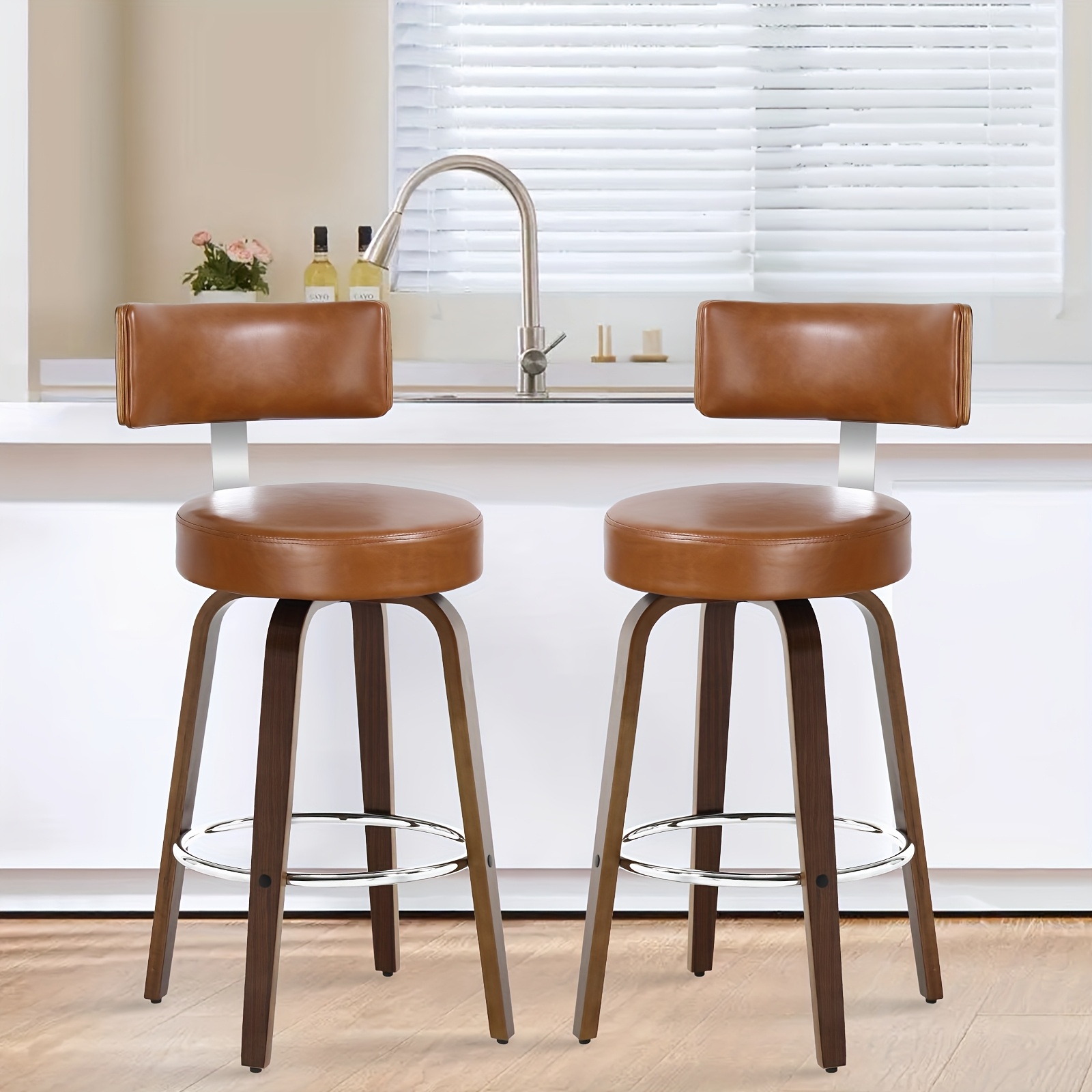 Bar Stools Set of 2, Faux Leather 360° Swivel Barstools with Back and Round Seat, Modern 26"/29" Bar Height Upholstered Bar Chairs Island Stools for Kitchen Counter, Walnut Bentwood Legs
