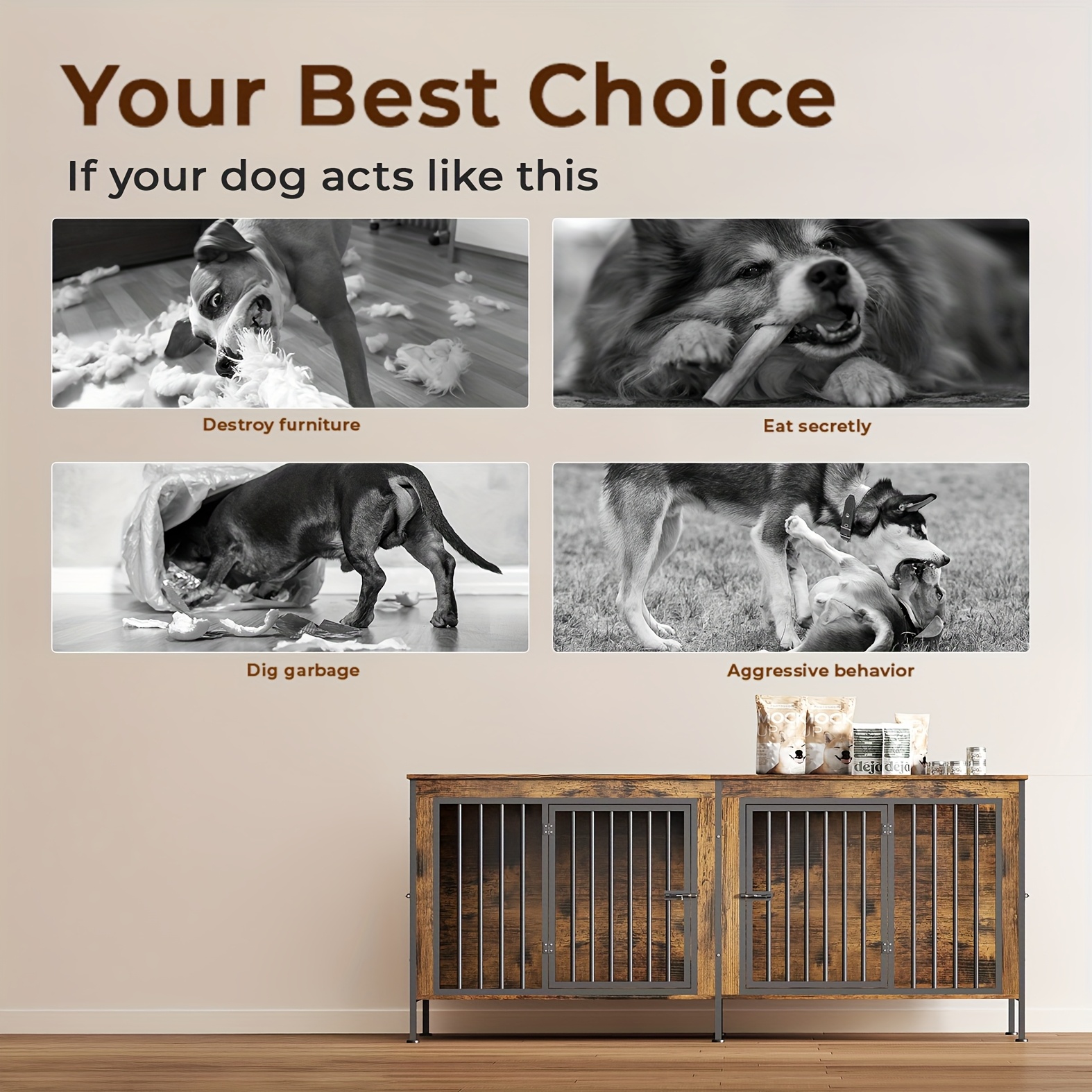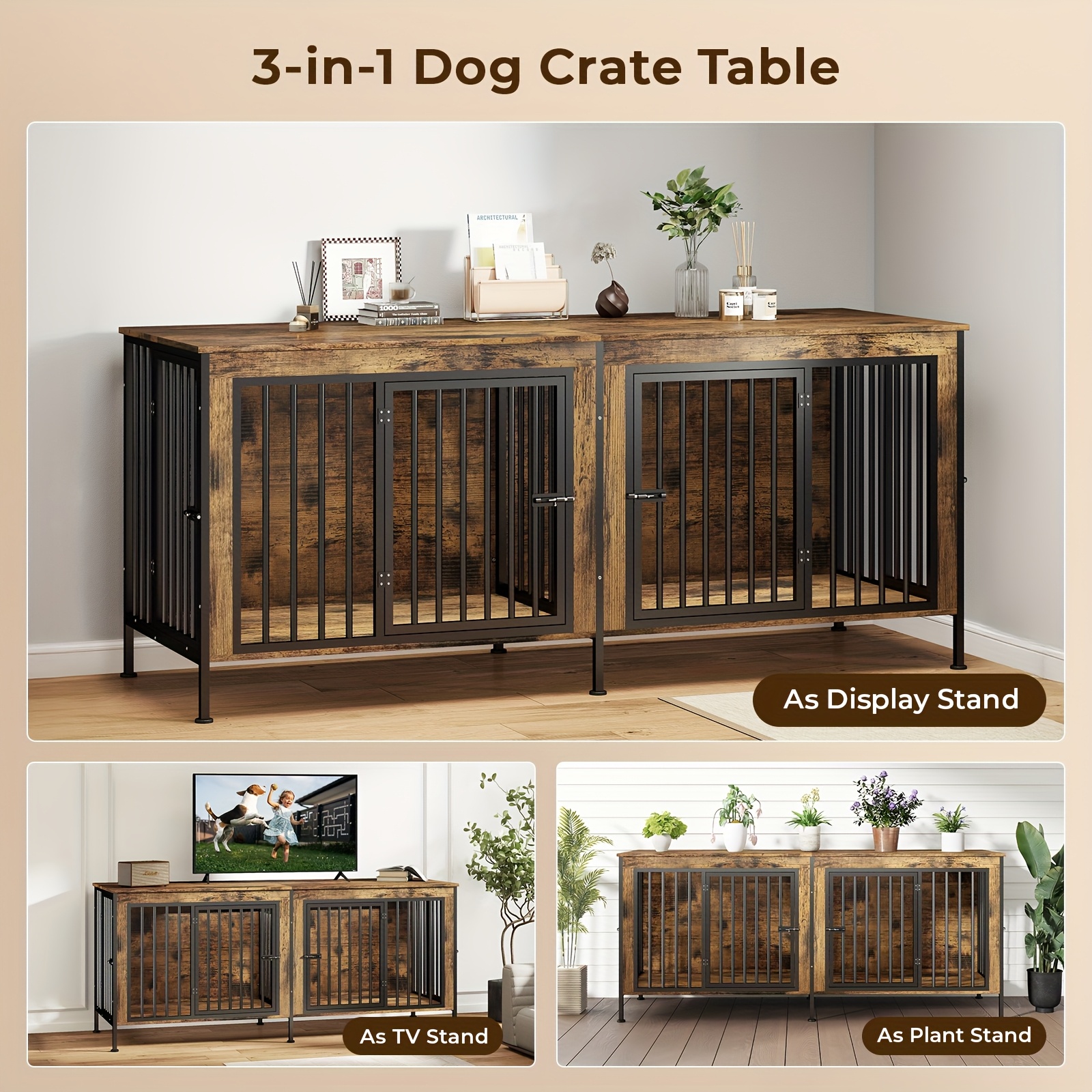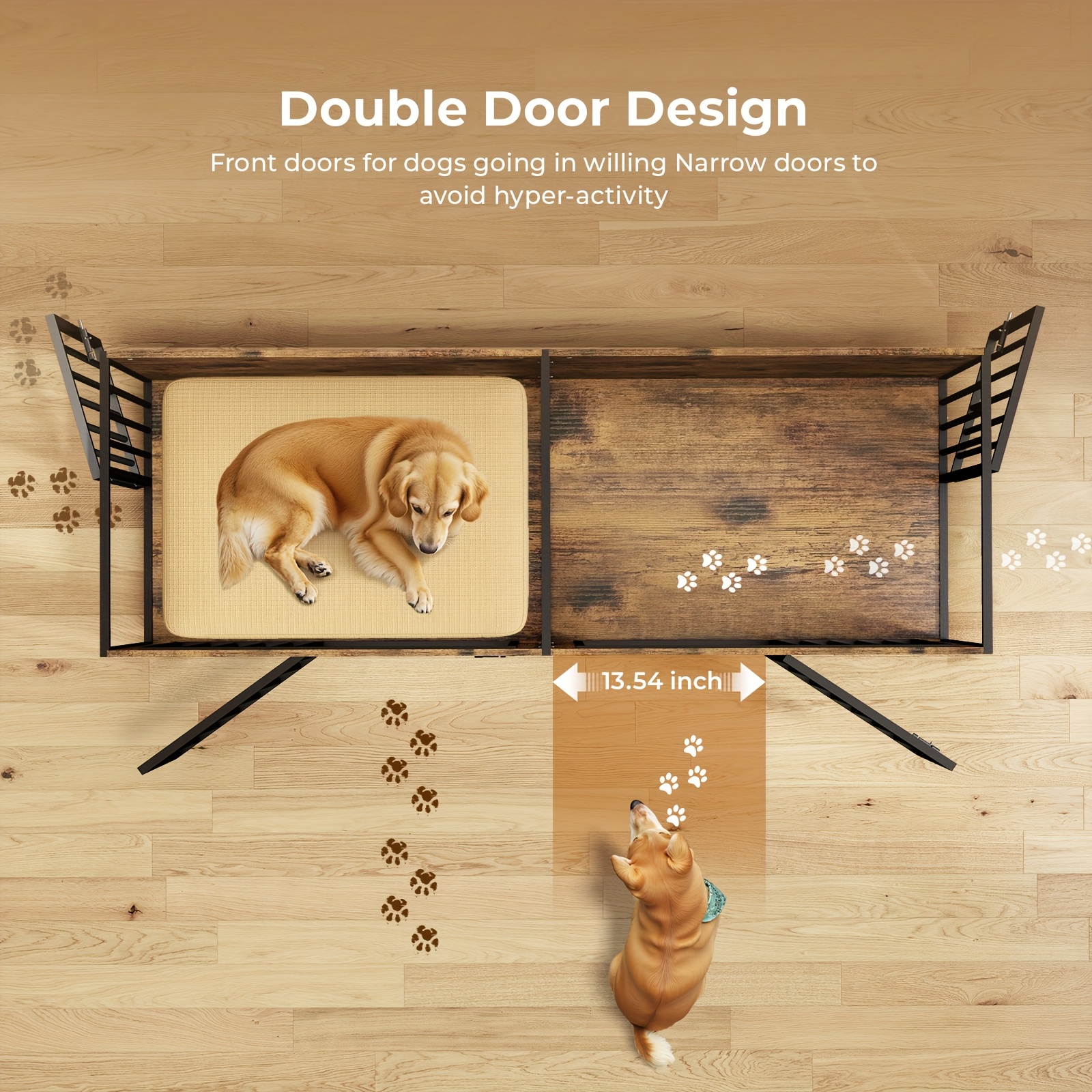 Dog Cage Furniture, XXL 78" Thick Wooden Frame & Iron Construction, Removable Divider Double Doors Durable Sturdy Design, for 2 Large Medium Dogs, Brown