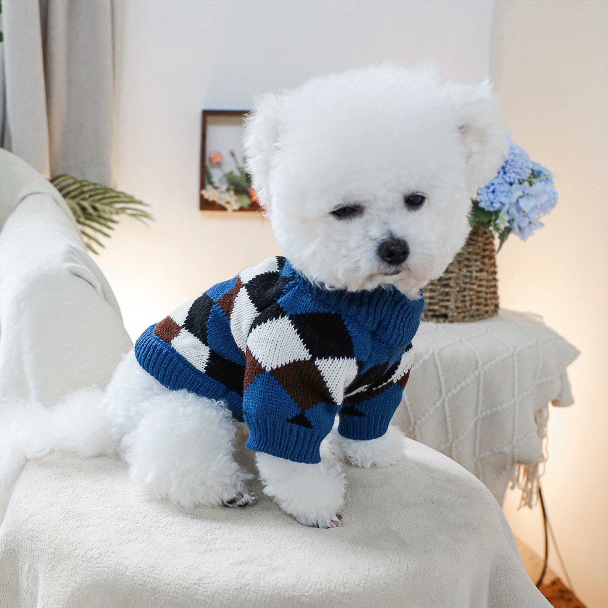 Dog Knitted Sweater Vintage Rhombus Pattern Ribbed Fall Winter Warm Clothes for Small Dog and Cat