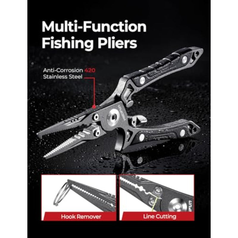 Water-Resistant & Resilient: fishing tackle bag made with high-end equipment, our 1000D high density nylon fabrics are water-resistant and abrasion-resistant. Our KAM buckles and SBS zips are indestructible and resilient Adjustable & Detachable Strap: Two left/right exchangeable, adjustable, and detachable shoulder straps make it easy to use this bag as a sling shoulder bag, backpack, handbag, chest bag, fishing tackle bag, or traveling bag. With two rod belts to hold your rods, the main strap length can be extended up to 51.2'', while the associate strap can be extended to 36.2'' Complete 6pc Fishing Kit Includes: Fishing Line Spooler (Stepl Adjustment & Quick Release Button) - Stainl Steel Fishing Pliers - Non-Slip Fillet Knife with Hollowed-Out Scabbard - Braid Scissors - Aluminum Fish Gripper (Lightweight & Corrosion-Resistant) - Lightweight Detachable Lanyard Speed E Fishing Line Spooler: Zero Line Twist with Tension Band, Stepl Adjustment for 1.6" Rods/Tables, 1-Click Locking, 6.3"/3.6oz Portable, Fits 3.9" Spools (3000m Braid) & Quick Release Button Heavy-Duty Saltwater Fishing Pliers: Stainl steel construction for extreme durability (US high-intensity fishing), tungsten carbide s cut braided lines effortlly, non-slip TPR grip resists water slipping, locking clip prevents accidental scratches, PTFE Teflon coating for ultimate corrosion resistance
