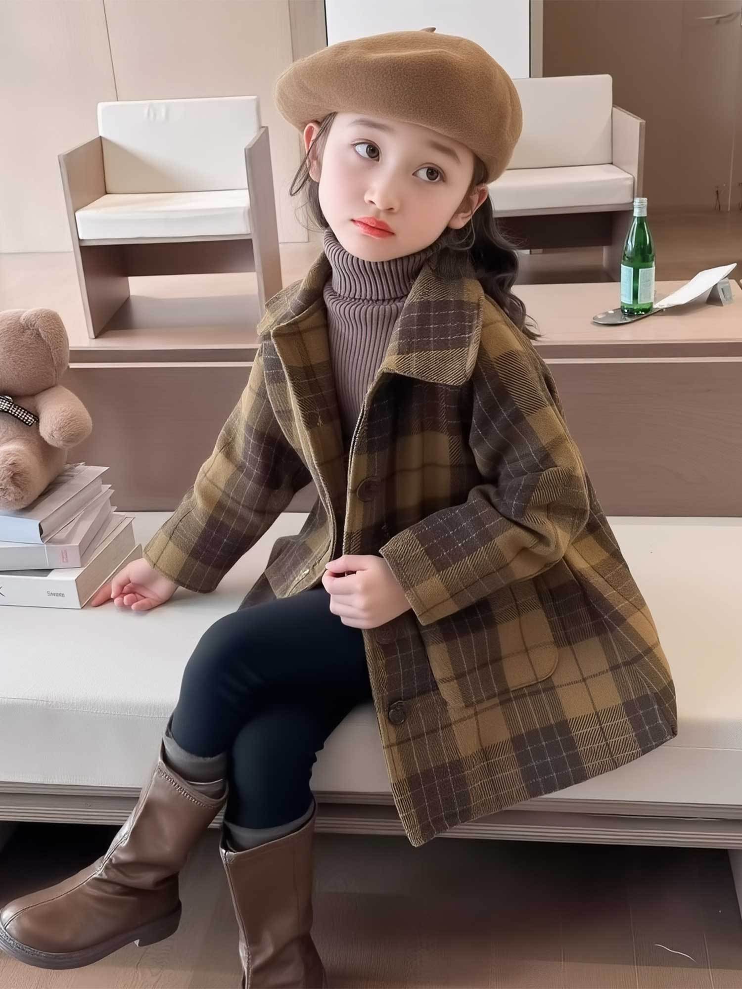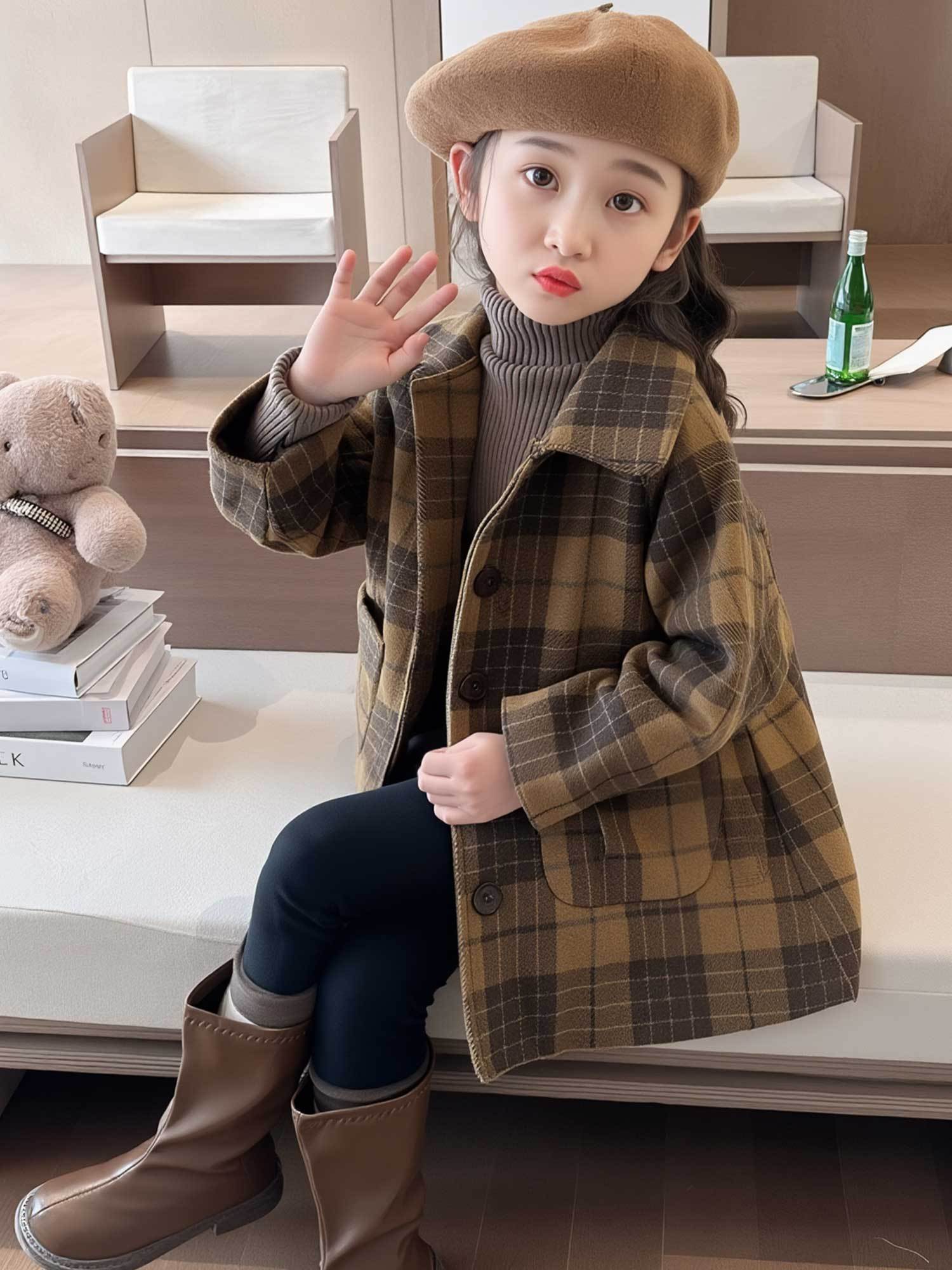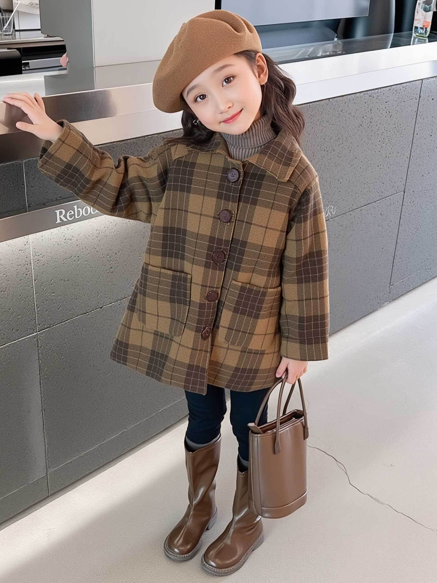 Girls' British Academy Tartan Fleece-Like Coat - Soft Warm Lapel Jacket with Houndstooth-like Plaid (Brown/Beige), Loose-Fit Long Sleeve Button Front Closure, Machine Washable & Casual Outerwear for Older Kids (No Belt)