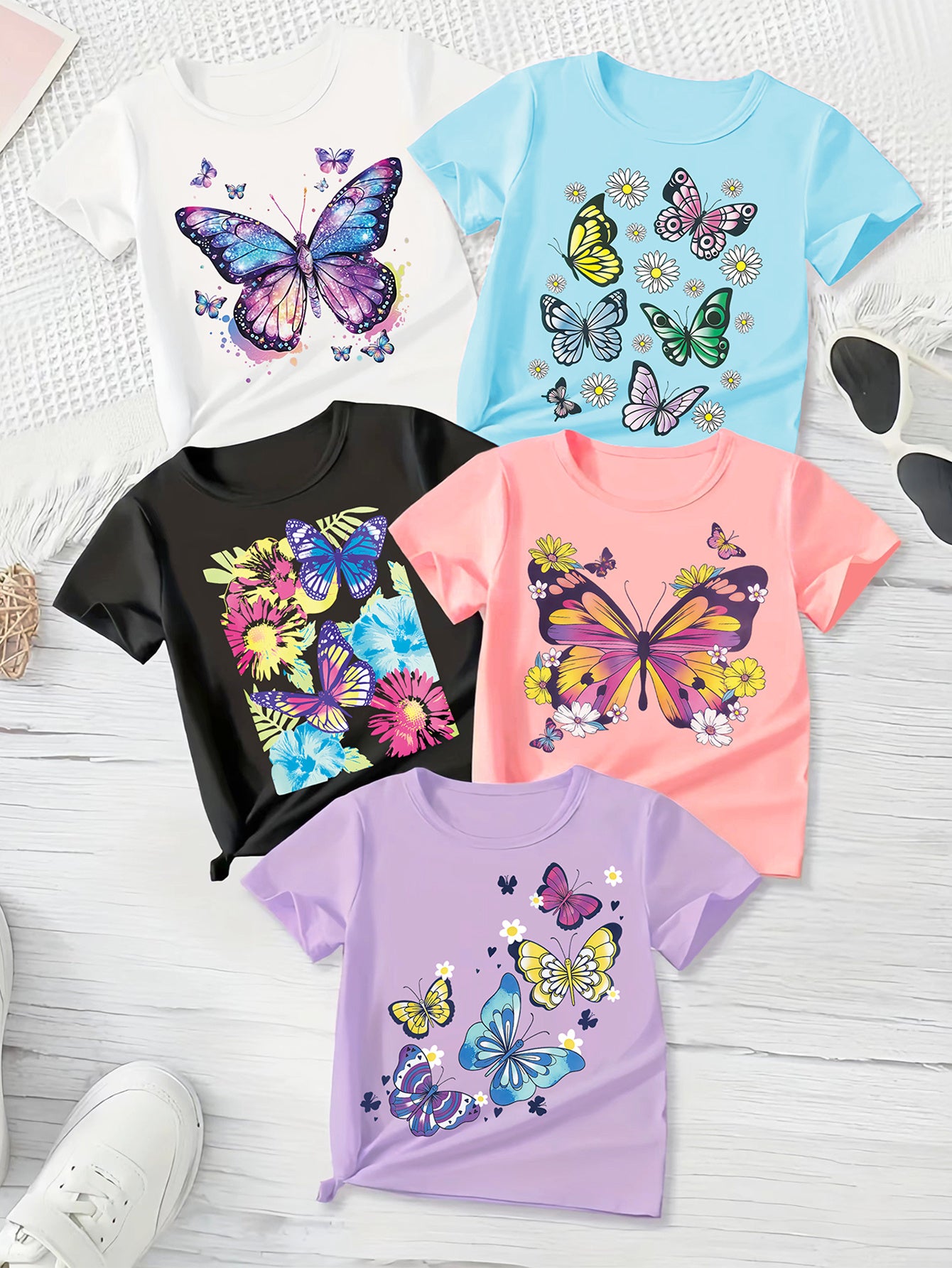 [Girls' Butterfly T-Shirt Set] 5pcs Set of Girls' New Fashionable Round Neck Short Sleeved T-shirt with Interesting Butterfly Pattern Print, Comfortable Polyester Fiber Casual Summer Top