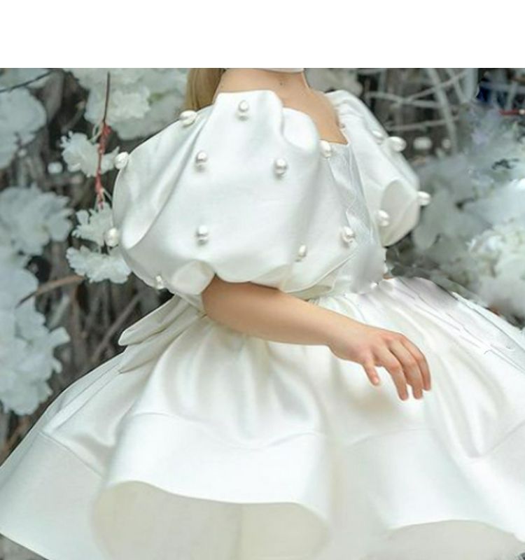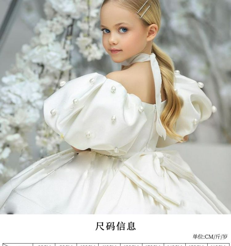 Girls' Elegant White Fluffy Yarn Princess Dress with Ruffled Neckline & A-Line Silhouette - Layered Tulle Skirt, Fitted Bodice & Bow Accent - Formal Evening Party Wedding Performance Outfit for Flower Girl, Hostess - Summer S
