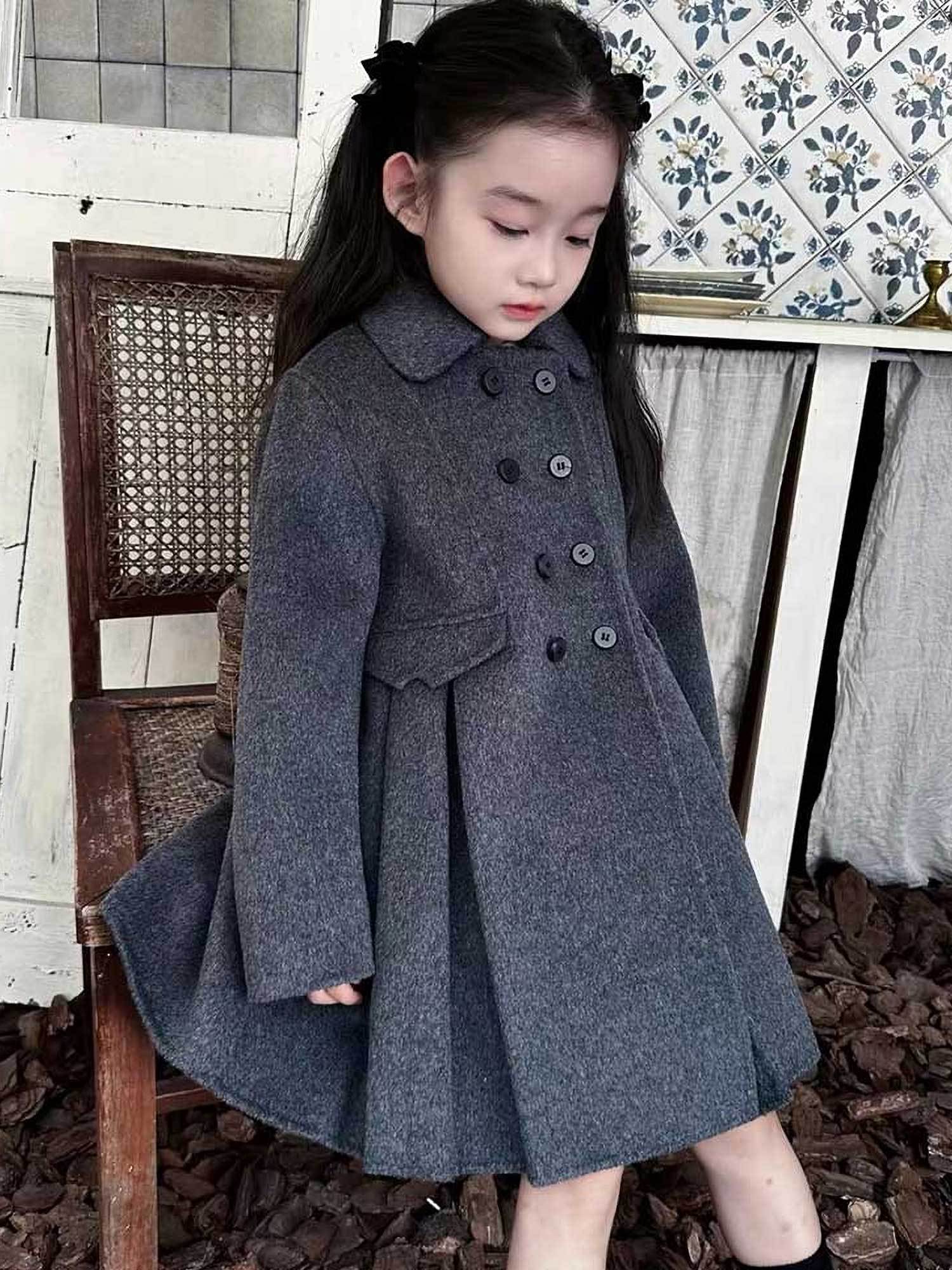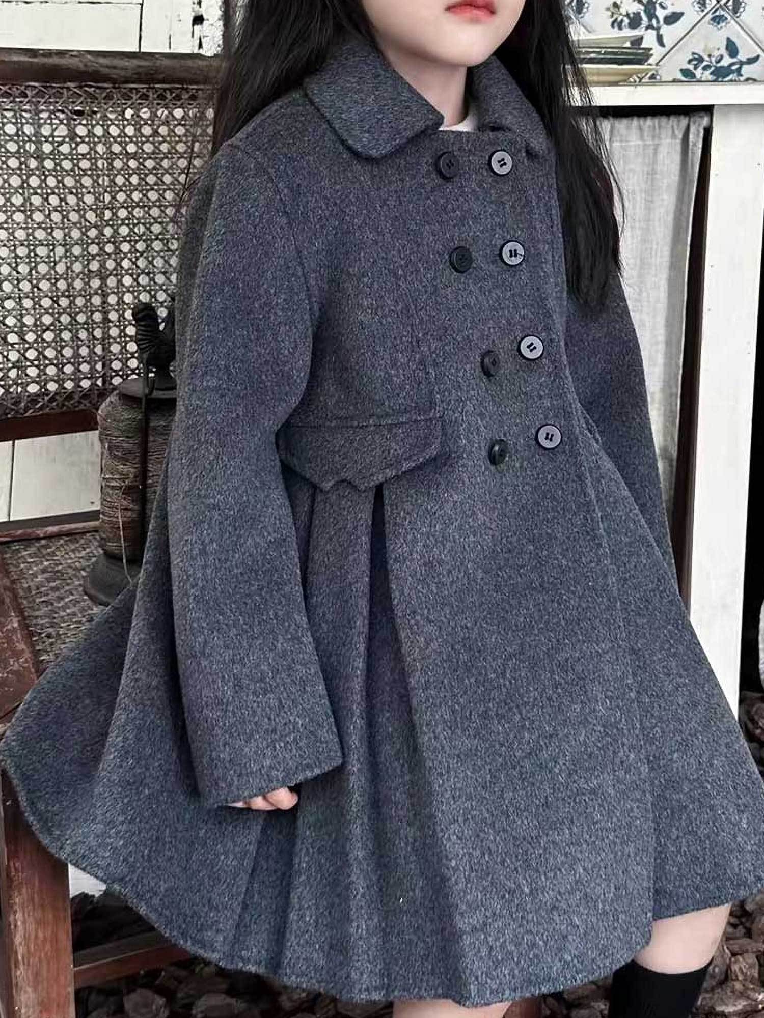 Girls' Vintage Double-Faced Fleece Coat with Skirt Hem - Dark Gray Button-Front Closure, Warm Winter Jacket, Lining & Classic Collar, Long Sleeve Casual Outerwear for Fall/Spring, School & Special Occasions (Regular Fit), Fal