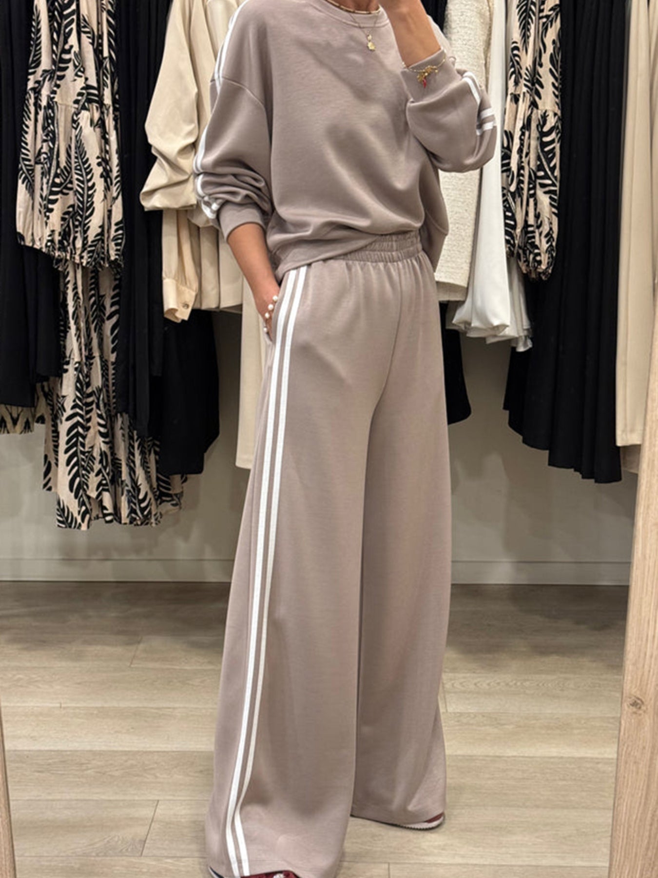Oatmeal Varsity Striped Detail Crewneck Pullover Elastic Sweatpants 2pcs Outfit, Casual Outfit, Minimalist Fashion, Varsity Style, Comfortable Material, Warm Pullover, Streetwear Fans, College Students