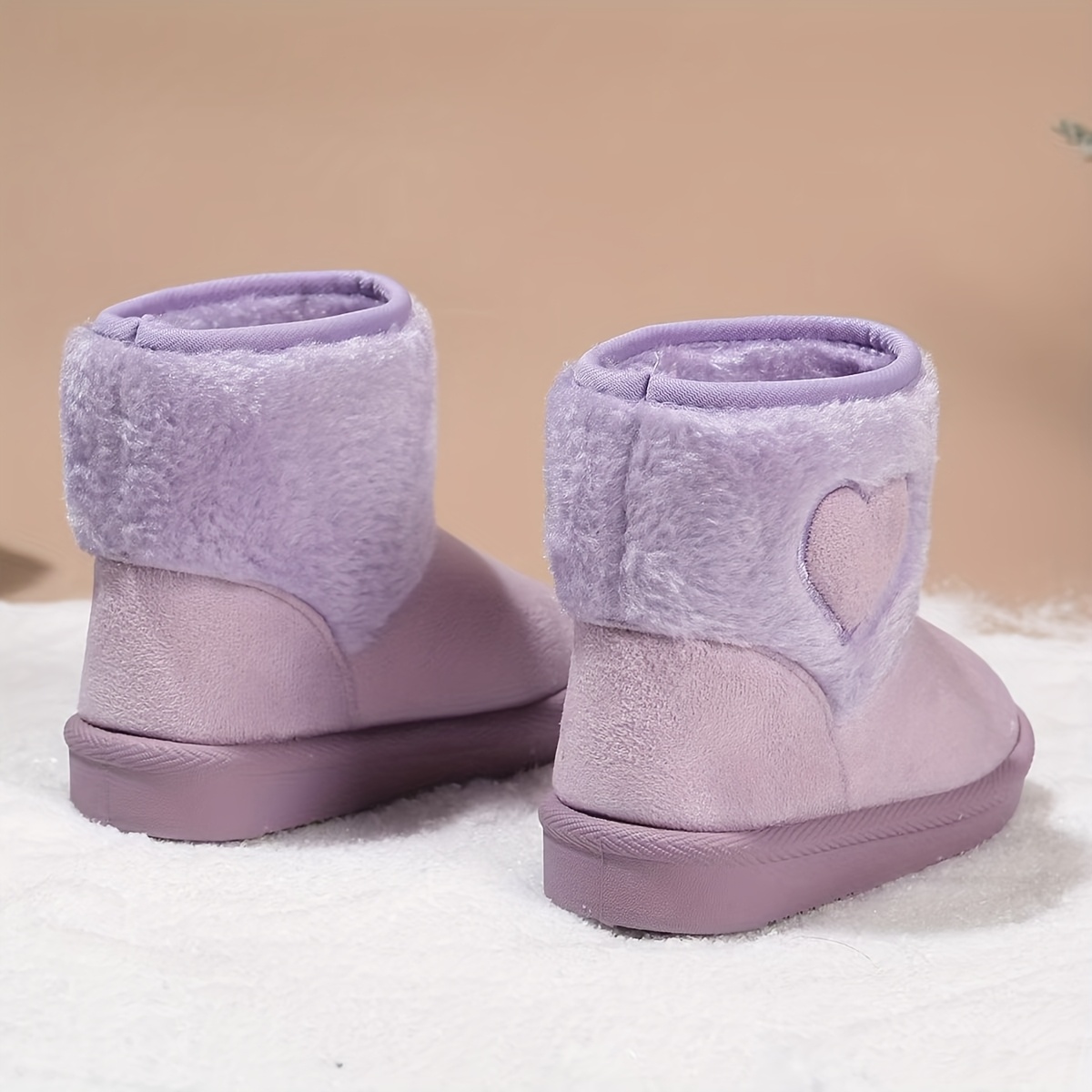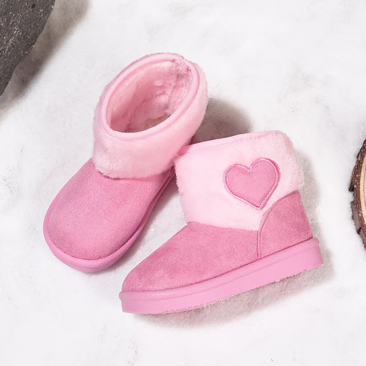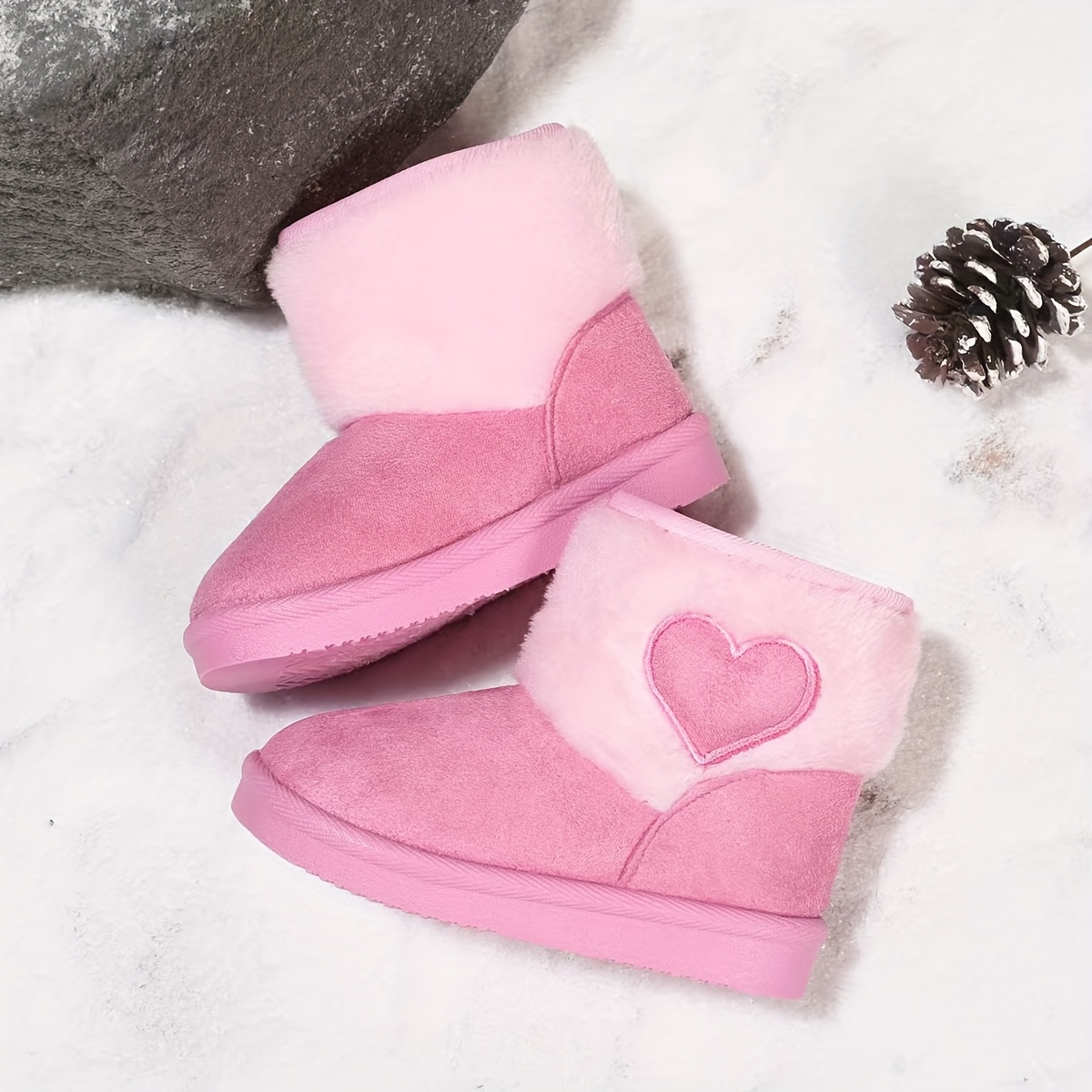 ' Pink Plush Winter Snow Boots with Heart Cutouts - Short Ankle Warm Traction Sole, Slip-On & Buckle-Free Closure, Soft Fabric for & (Pink) - Cozy Outdoor & Cold Weather Footwear