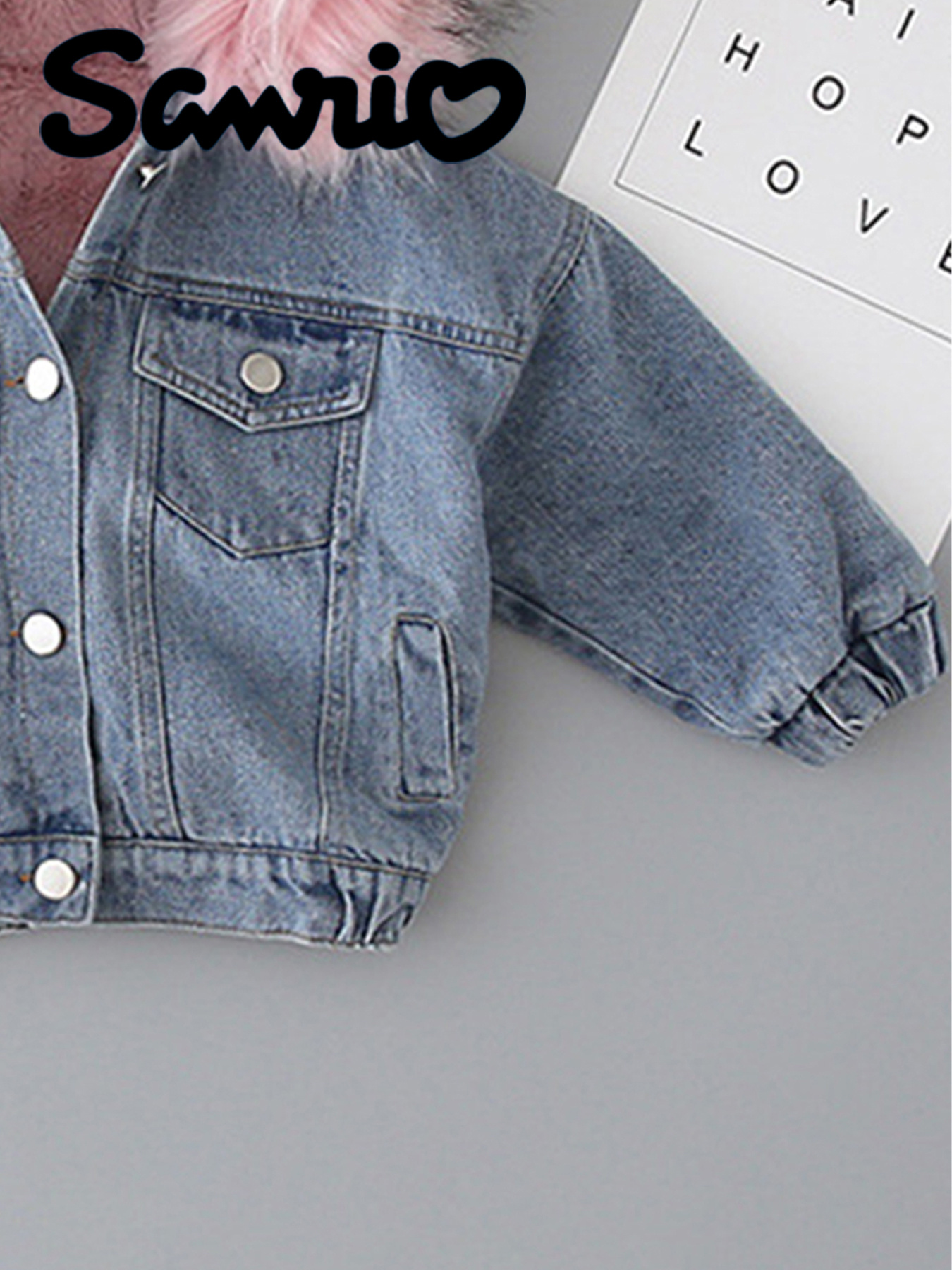 Sanrio Official Licensed Girls' Hello Kitty Kuromi My Melody Cinnamoroll Denim Jacket - Thickened Fleece-Lined Hooded Winter Coat with Pink Fleece Trim, Cute Anime Characters, Retro Style, Cozy Fall & Winter Outerwear, Perfec